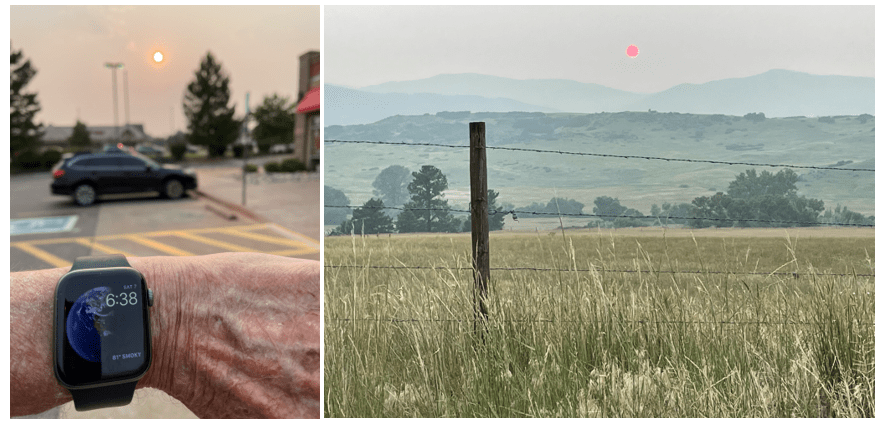 Colorado, known for clear skies most days of the year, is inundated by smoke from the California and Oregon forest fires as I draft this. The Air Quality Index, normally well below 50, was over 150 on August 7. The weather app on my watch used a word I’ve never seen it use before: SMOKY. Here are two pictures of the setting sun, the first is in the Denver area. The second, about half an hour later, was made between Sedalia and Palmer Lake on Colorado 105. The small mountains there are only a few miles away and still nearly invisible.